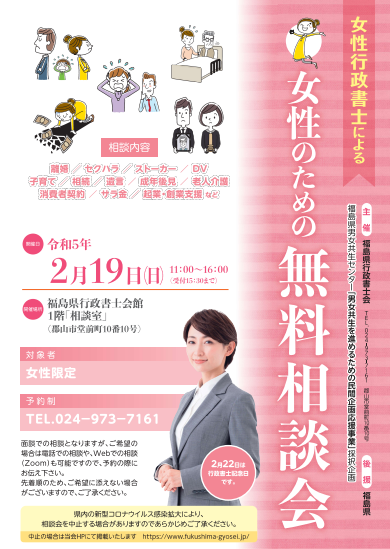 行政書士記念日事業として、女性行政書士による女性のための無料相談会を下記の日程で開催いたします。