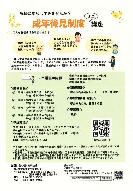 郡山市成年後見支援センター「成年後見制度ミニ講座」開催のお知らせ 2025.04.11 News 郡山市成年後見支援センター「市民向け 成年後見制度ミニ講座」開催のお知らせ ※画像をクリックするとPDFが開きます。