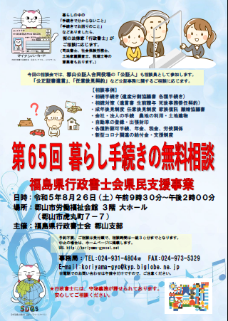「福島県行政書士会郡山支部 第65回暮らし手続きの無料相談」を開催いたします。 2023.07.31 News 「福島県行政書士会郡山支部 第65回暮らし手続きの無料相談」を開催いたします。 今回の相談会では、郡山公証人合同役場の「公証人」も相談員として参加します。「公正証書遺言」、「任意後見契約」など公証事務に関するご相談に応じます。 ※画像クリックでPDFが開きます。