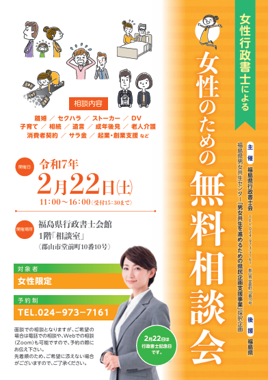 行政書士記念日事業として、女性行政書士による女性のための無料相談会を下記の日程で開催いたします。